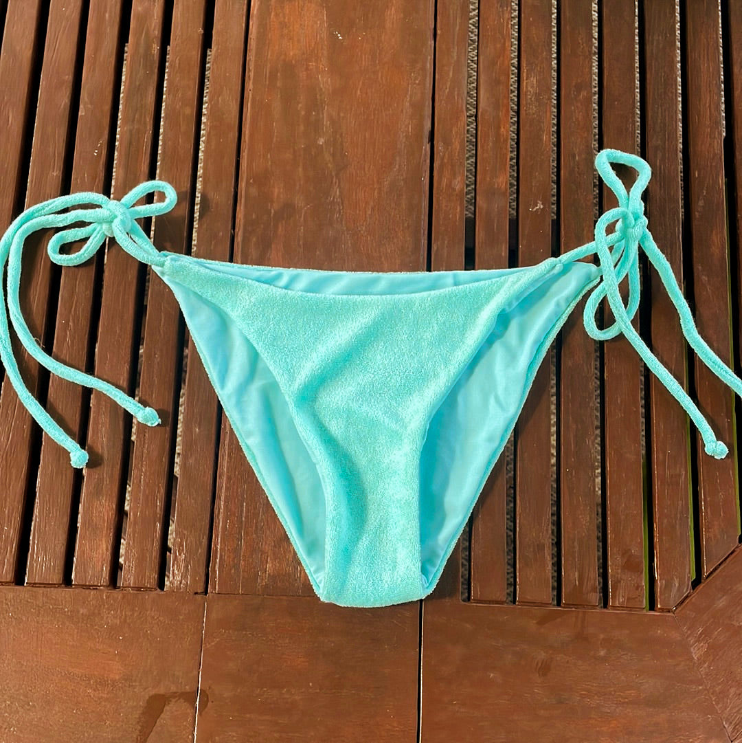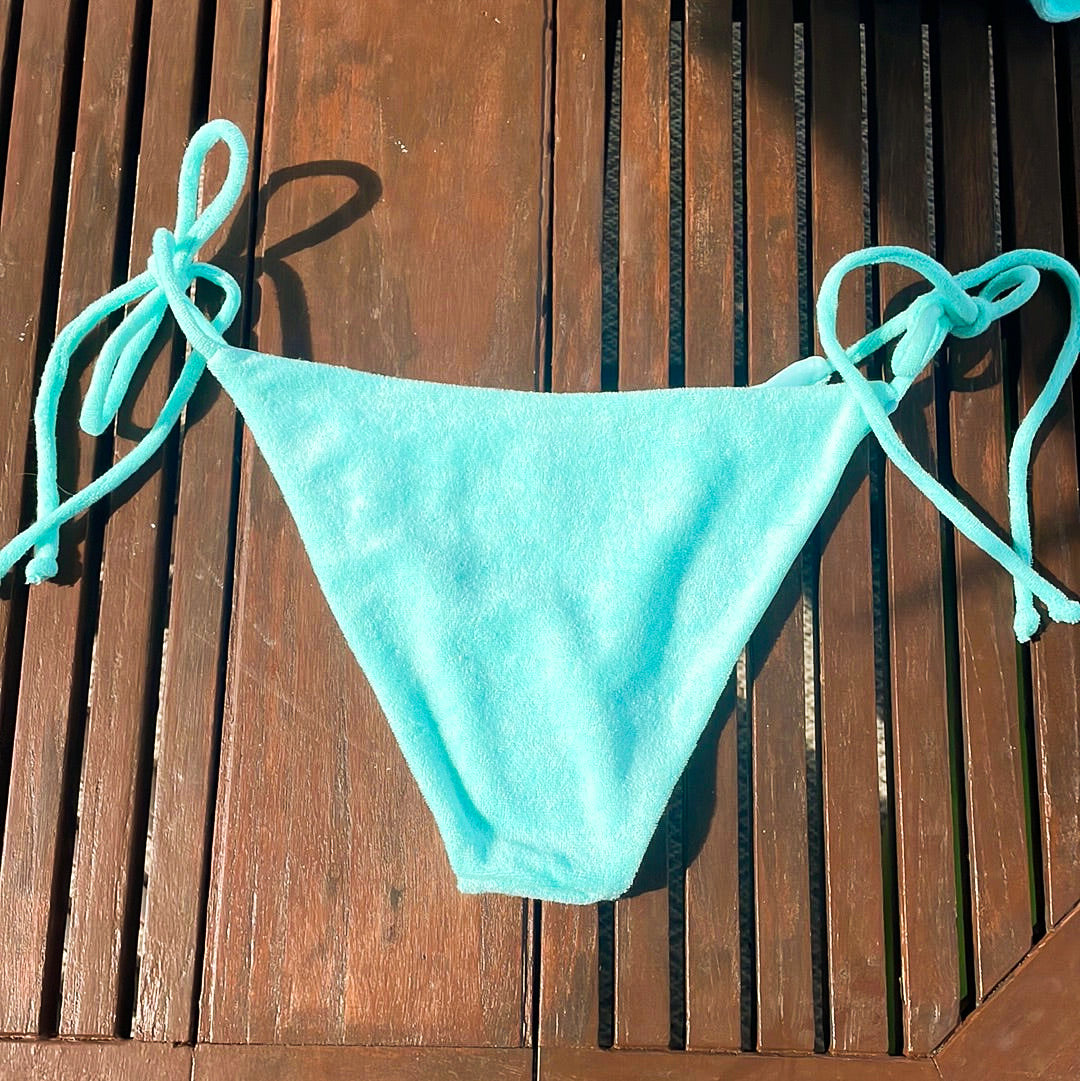 Catch a wave in these Terry-Towel Bikini Bottoms- AQUA. Crafted with beachy terrycloth towel material, they're sure to keep you looking cute and feeling extra comfy - just don't forget to size up if you've got a more bustier booty.
